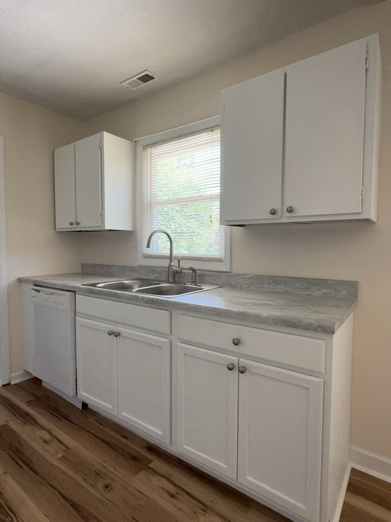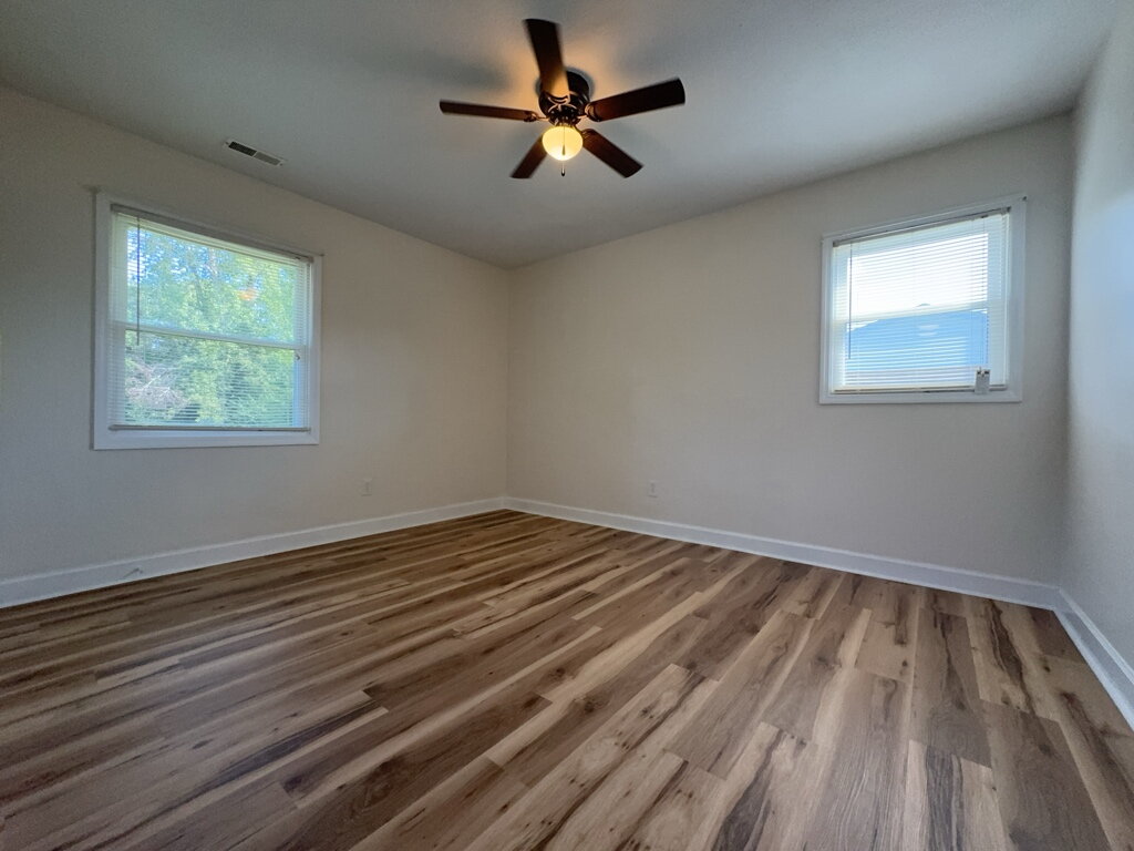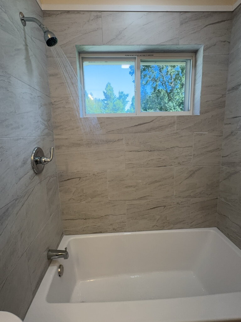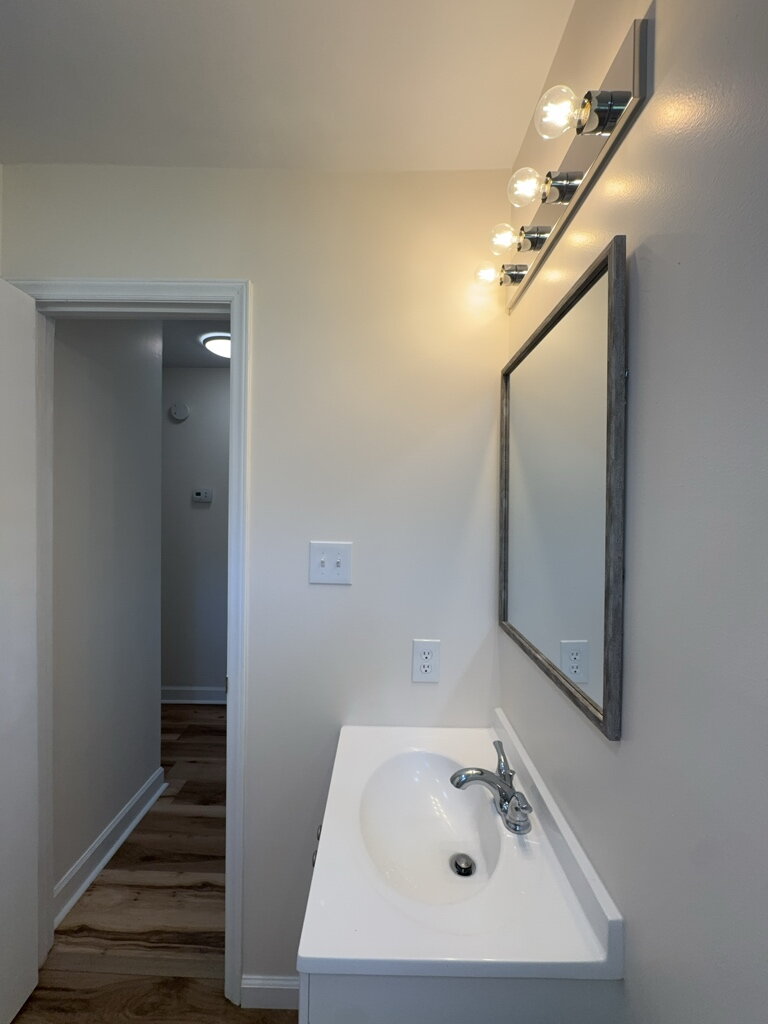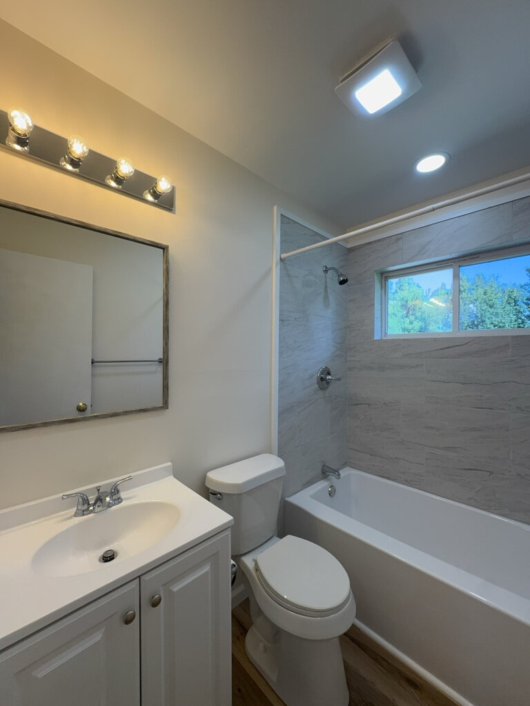 As you enter inside the home, you'll find new flooring throughout and a bright, open layout. The fully updated main bathroom features modern fixtures, clean grey-and-white tones, and a shower window that adds natural light and charm. The front of the home showcases full-length windows that let in the perfect amount of daylight, creating a warm, inviting space.
