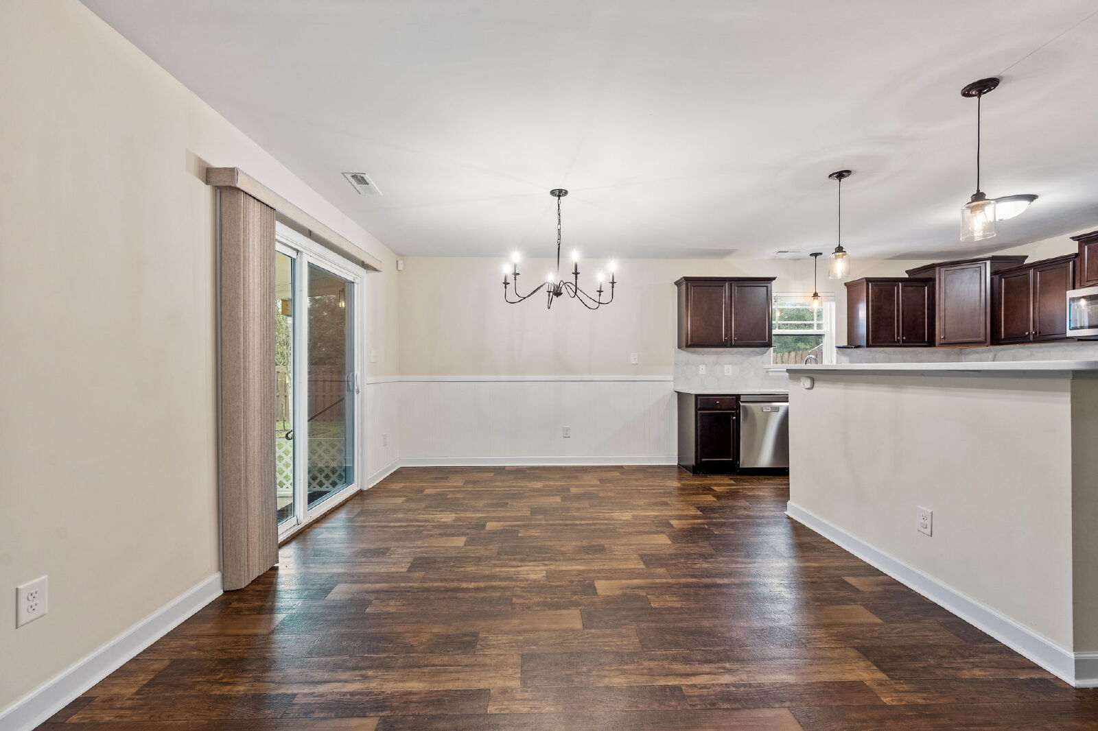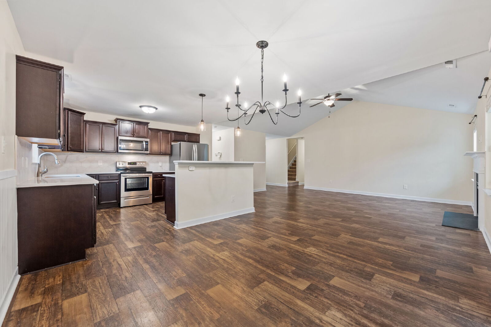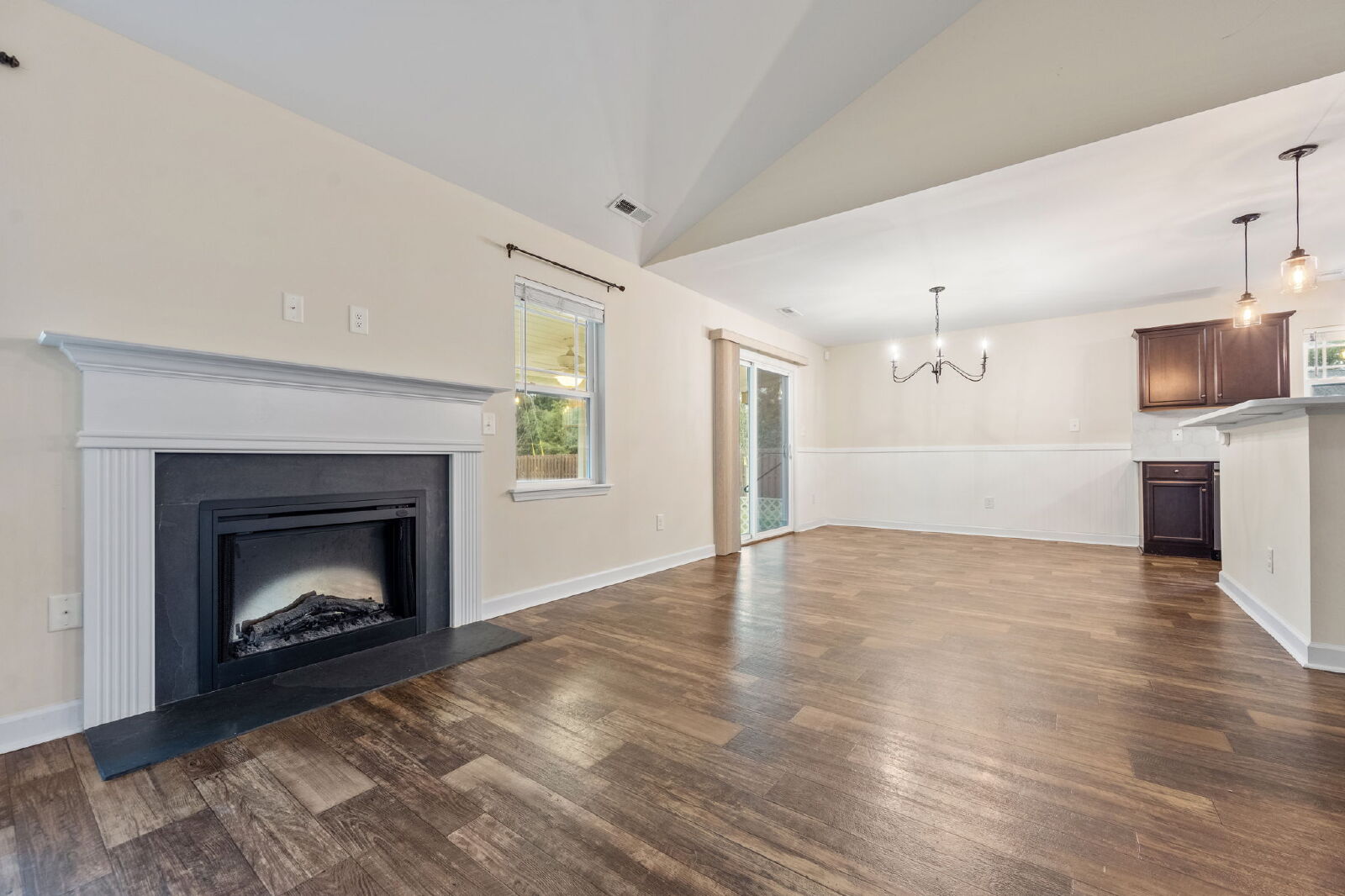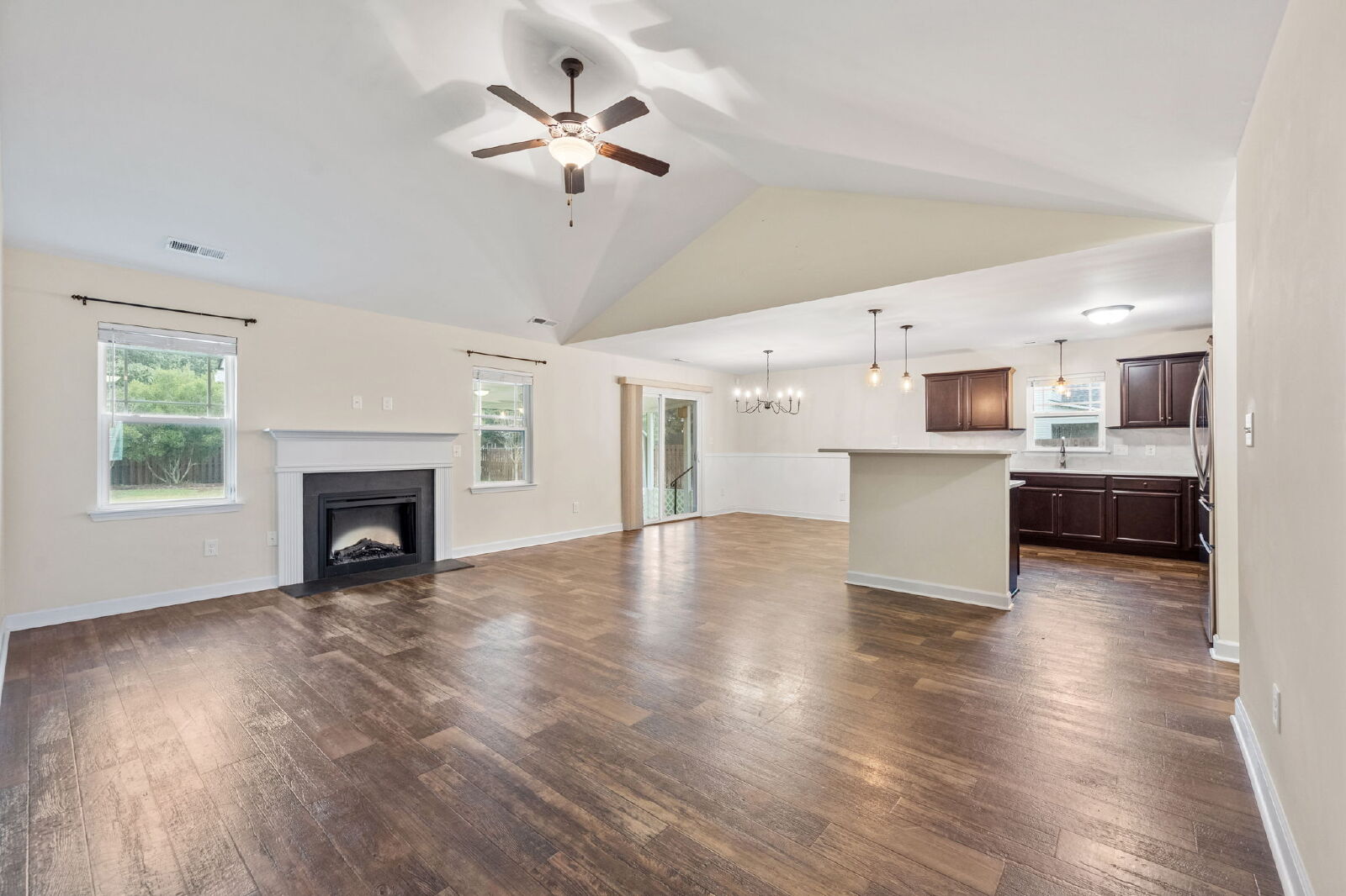 This home features an open layout that’s both functional and comfortable. The living room includes an electric fireplace, and the kitchen comes equipped with granite countertops, a drop-in sink, stainless steel appliances, and a large island. It opens to the dining and living areas, making it easy to entertain or enjoy everyday living.