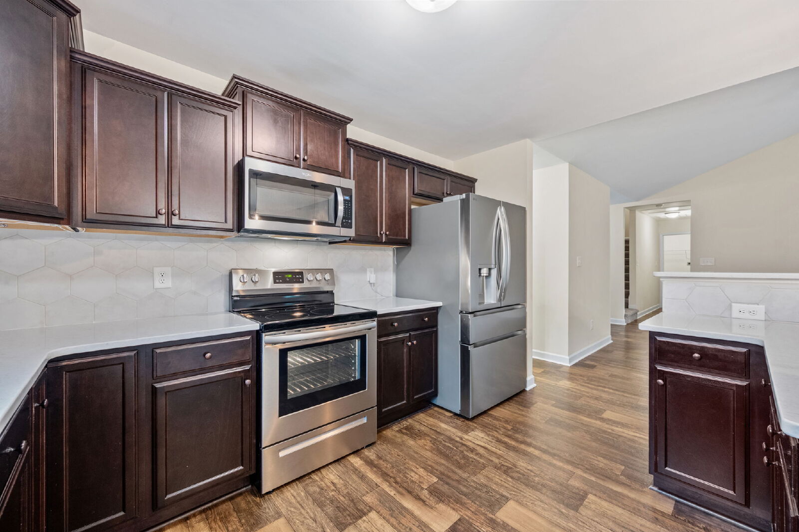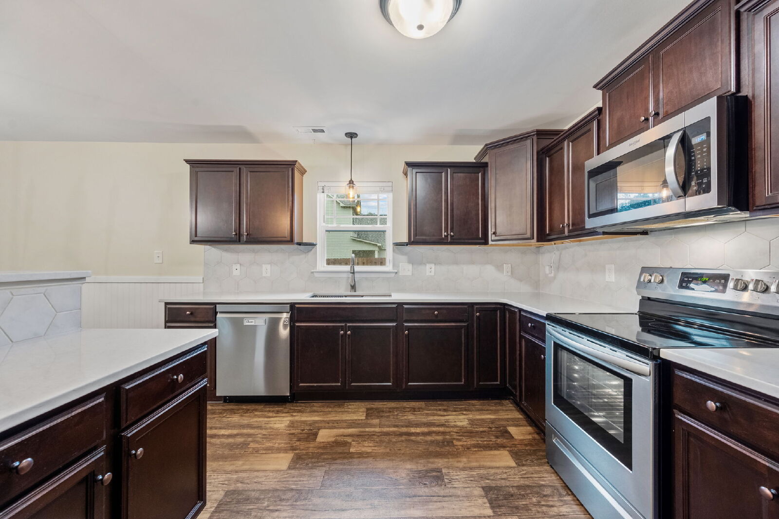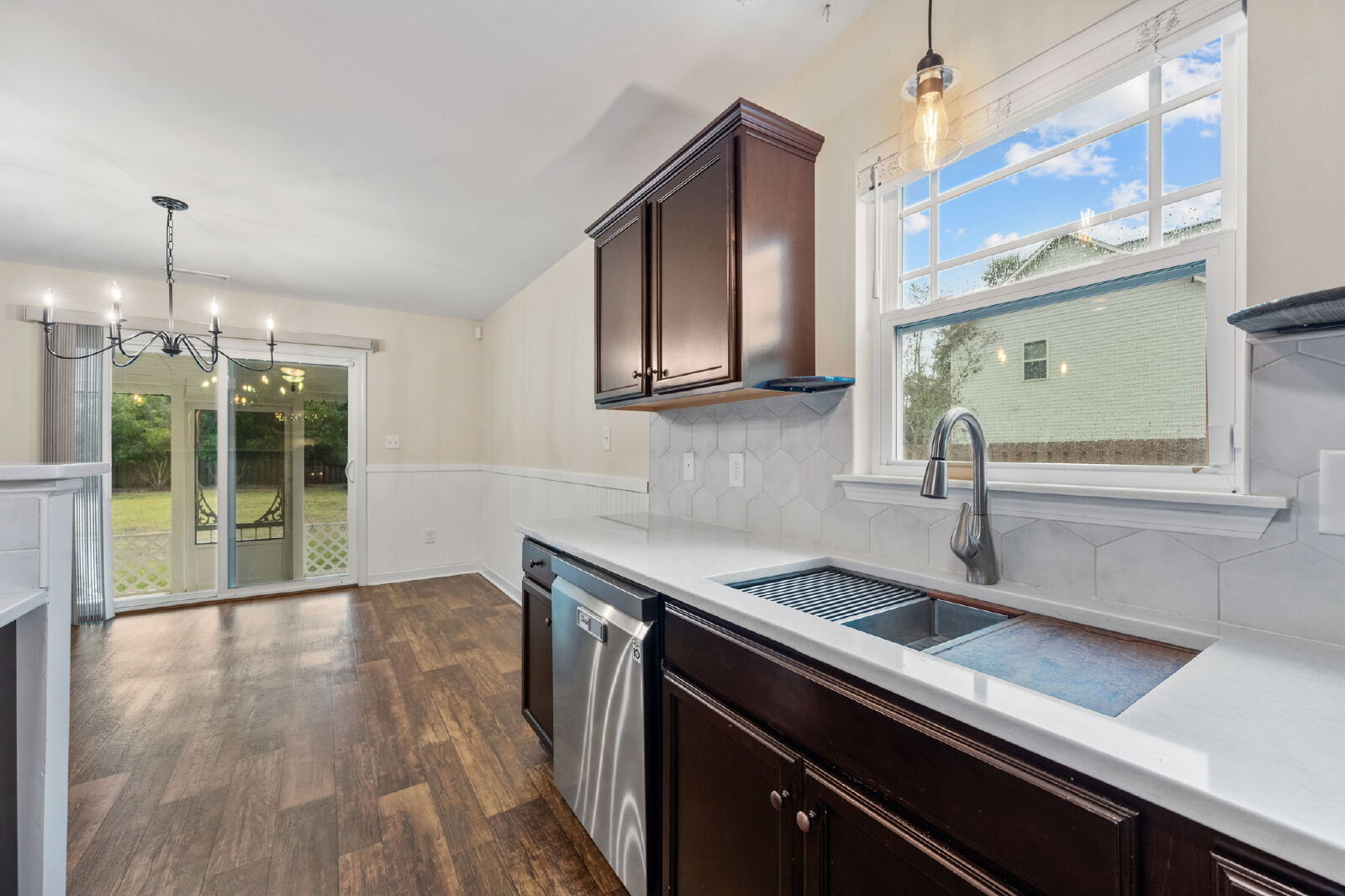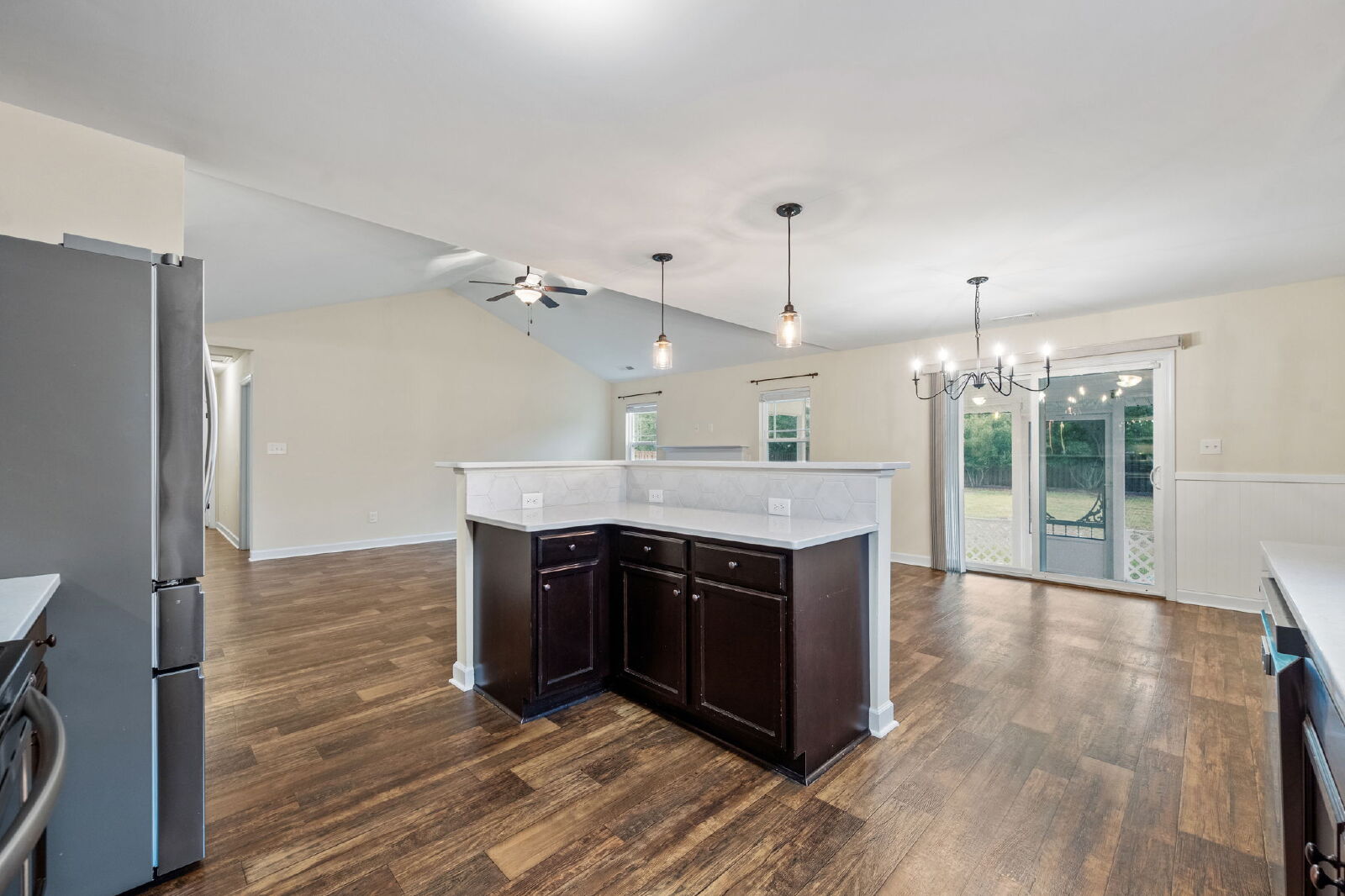 This home features an open layout that’s both functional and comfortable. The living room includes an electric fireplace, and the kitchen comes equipped with granite countertops, a drop-in sink, stainless steel appliances, and a large island. It opens to the dining and living areas, making it easy to entertain or enjoy everyday living.